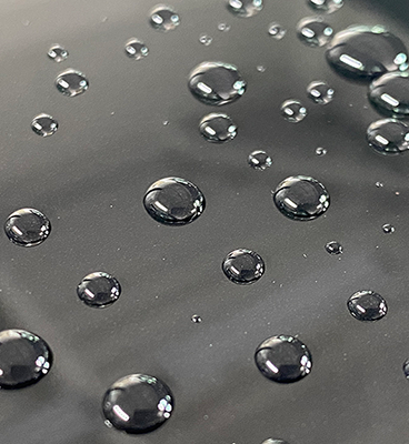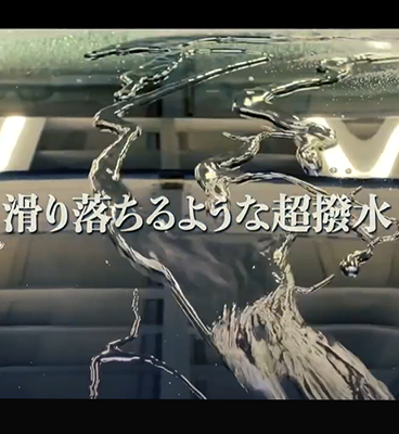 フッ素を加える事により、撥水性の効果を上げる他にも、長時間持続する耐久性、滑り落ちるような滑落性、防汚性を向上させる事に成功。